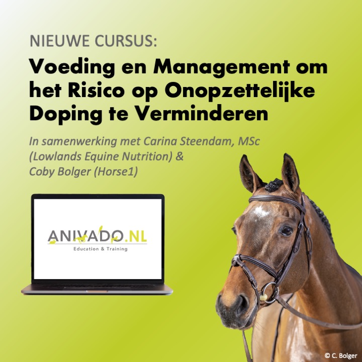 In deze cursus geven Carina Steendam MSc (Lowlands Equine Nutrition) en internationaal ruiter en expert op het gebied van paardenvoeding Coby Bolger (Horse1), educatieve en praktische informatie over het evalueren van het risico op voeding en management gerelateerd onopzettelijke doping. Je leert over de FEI-regels met betrekking tot onopzettelijke doping, de meest voorkomende bronnen van onopzettelijke doping bij paarden via voer, supplementen, topische producten, water en strooisel en acties die ruiters, trainers en andere verantwoordelijke personen kunnen ondernemen om het risico op een onopzettelijke positieve dopingtest te minimaliseren.