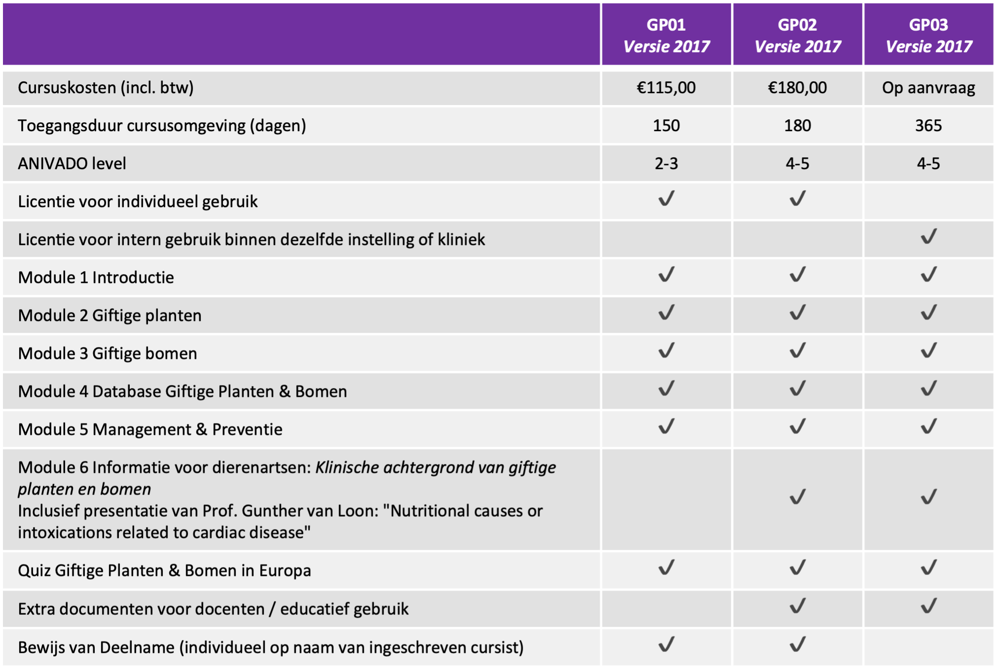 Wanneer u de cursus niet persoonsgebonden binnen een kliniek of instelling wilt gebruiken dan kiest u voor de aanschaf van GP03 ‘Giftige planten in Europa – Dierenartsen & Docenten – Uitgebreide licentie’. Deze cursus bevat dezelfde theoretische inhoud als GP02 en biedt daarbij een verlengde toegang tot de giftige planten database. Deze licentie geeft ook toestemming om binnen de kliniek/onderwijsinstelling de gegevens uit de cursus te tonen voor educatieve doeleinden of om deze cursus binnen een kliniek als naslagwerk te gebruiken. GP03 is niet persoonsgebonden waardoor een bewijs van deelname niet mogelijk is.